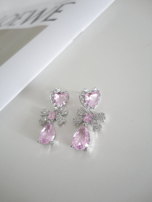 Silver Pink Heart Zircon Bow Drop Earrings