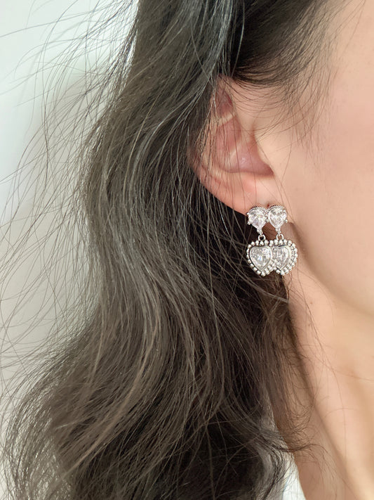 Silver Double Heart Zircon Drop Earrings