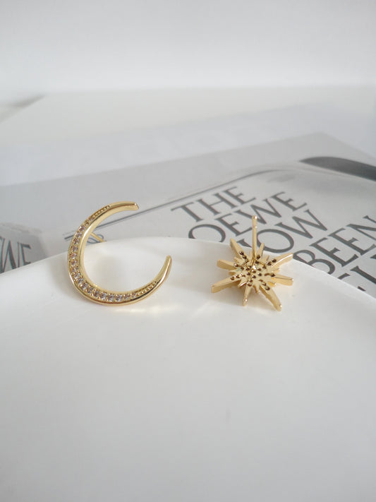 Golden Zircon Star and Moon Mismatch Stud Earrings