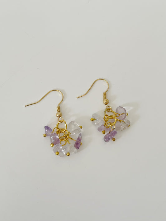 Handmade Three-Layer White Crystal, Amethyst, and Freshwater Pearl Ear Clips