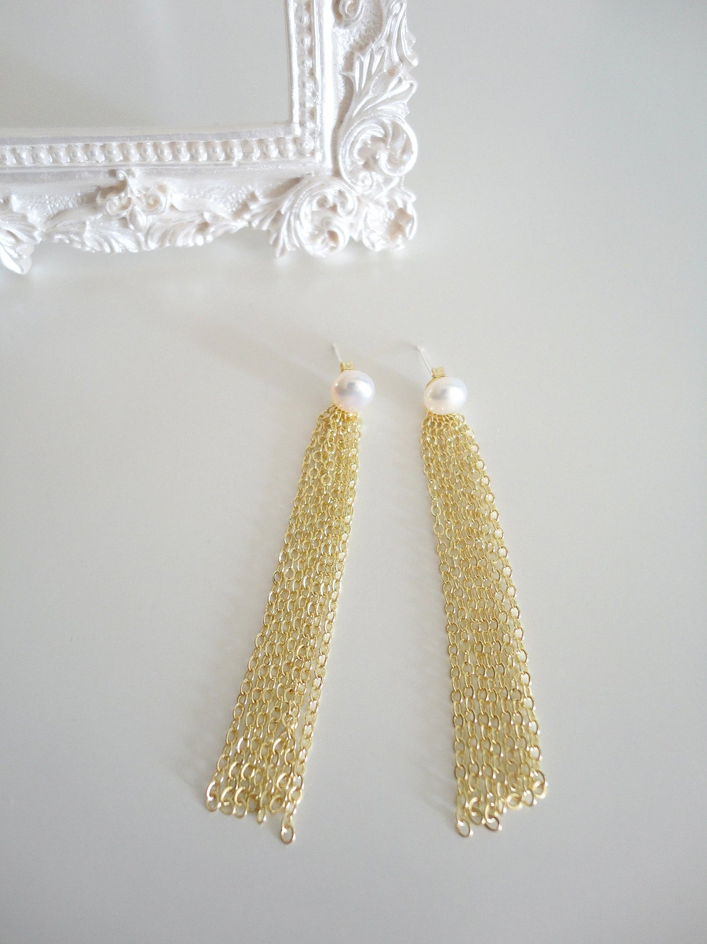 Freshwater Pearl with Golden Long Chain Tassel Drop Earrings