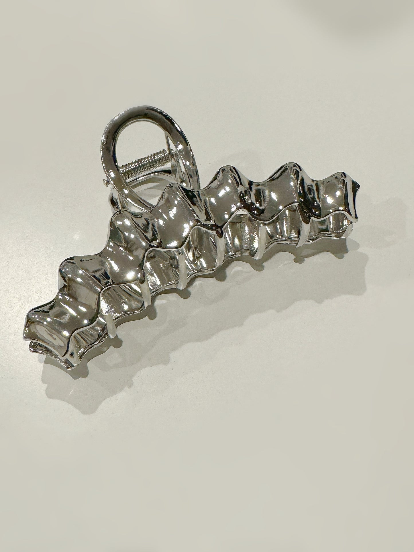 This corrugated metal hair claw clip is crafted with sturdy silver material for a durable and stylish accessory. The unique texture adds a touch of sophistication to any hairdo, while its strong grip ensures your hair stays in place. Elevate your look with this sleek and reliable hair accessory.