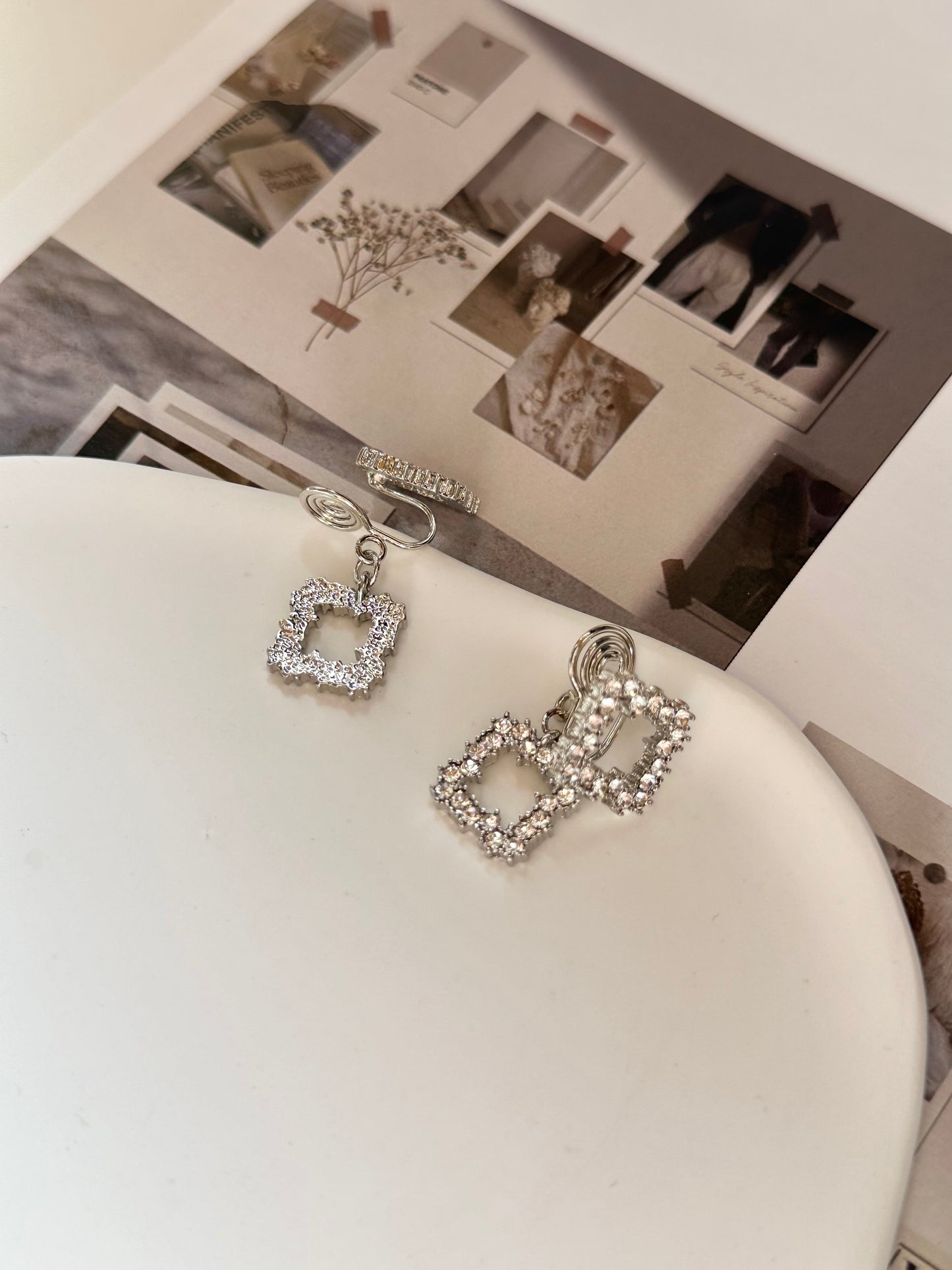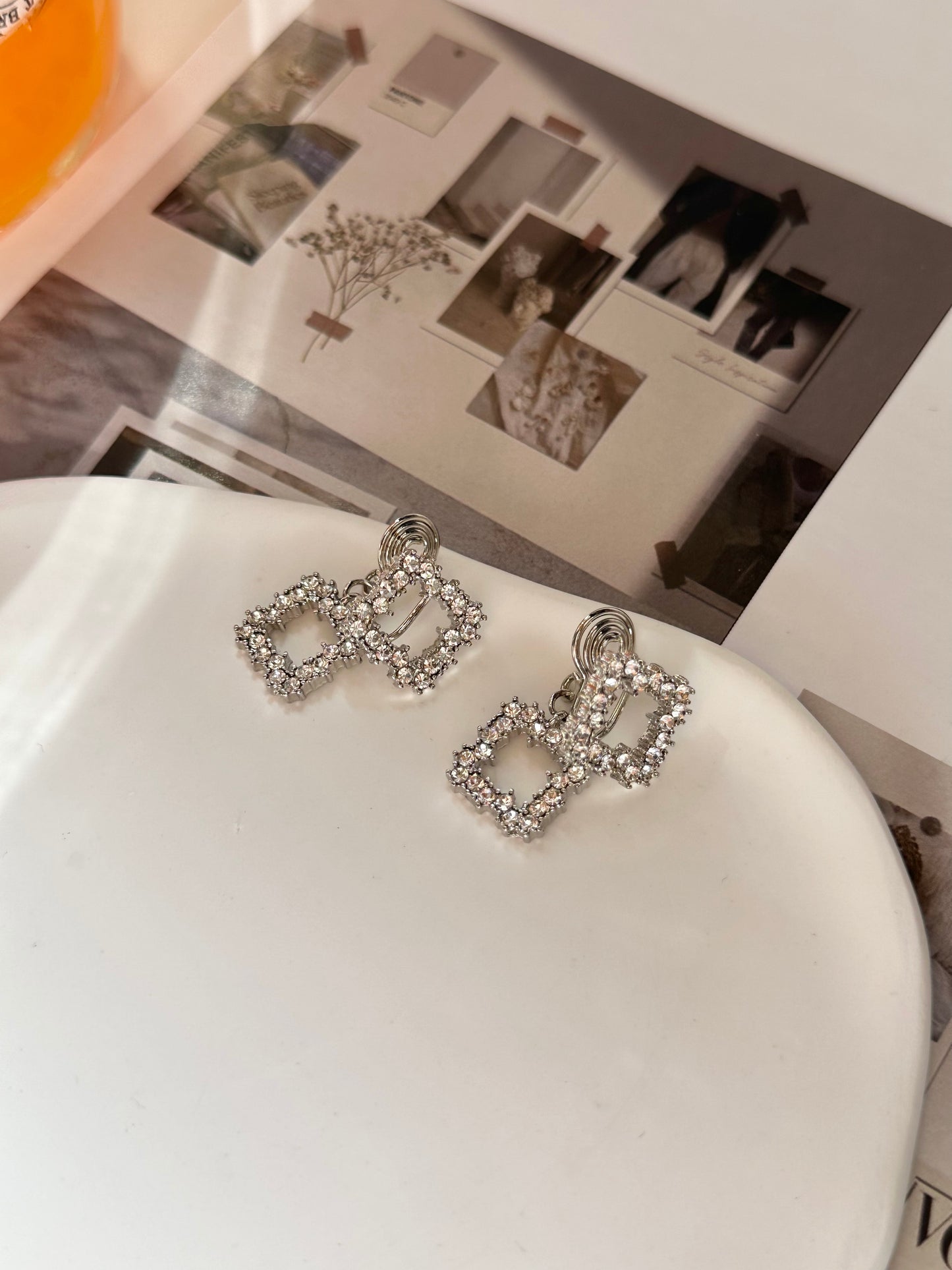 Silver Diamante Double Open Square Clip On Earrings