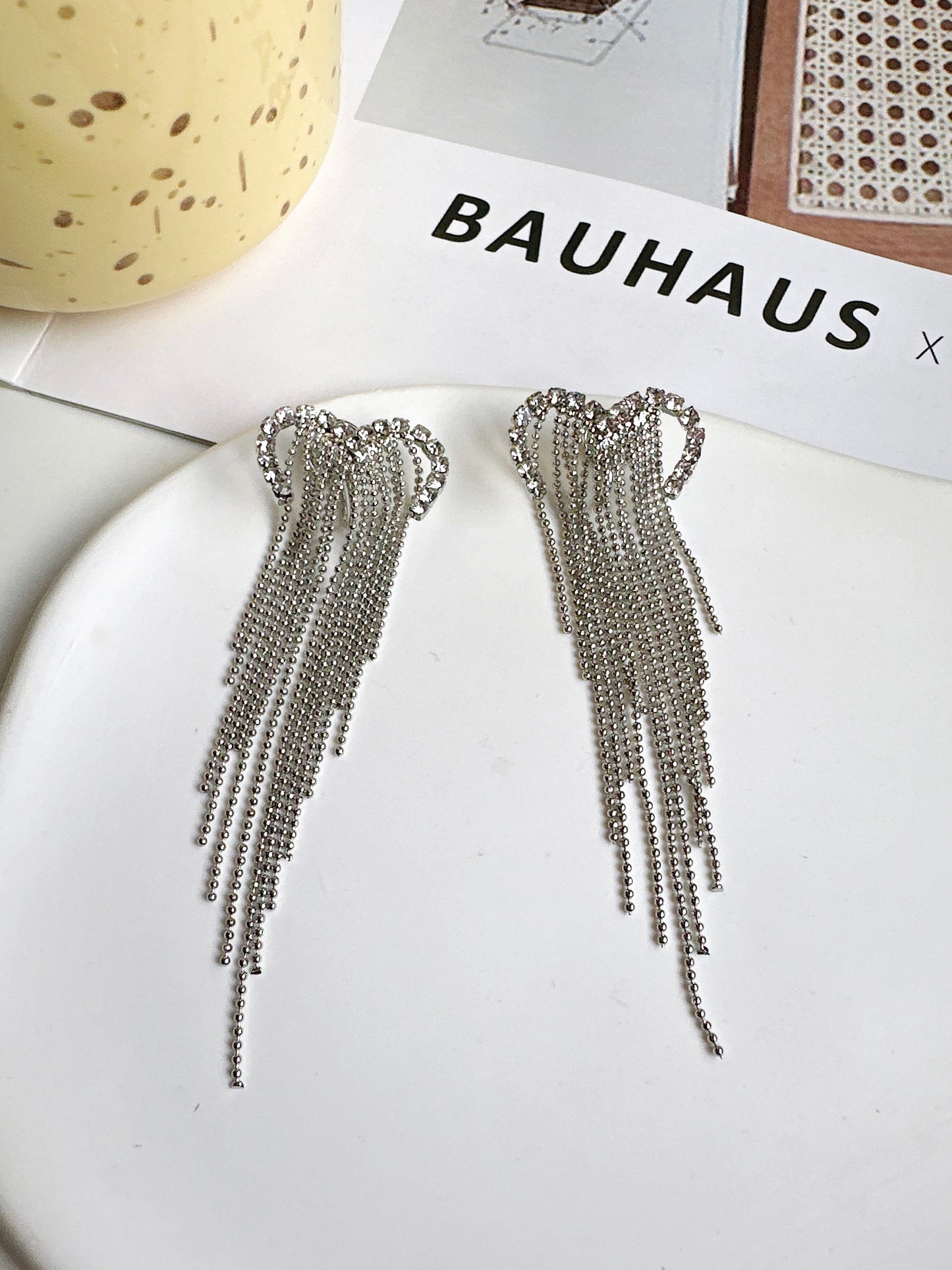 Silver Heart Diamante Tassel Clip On Earrings