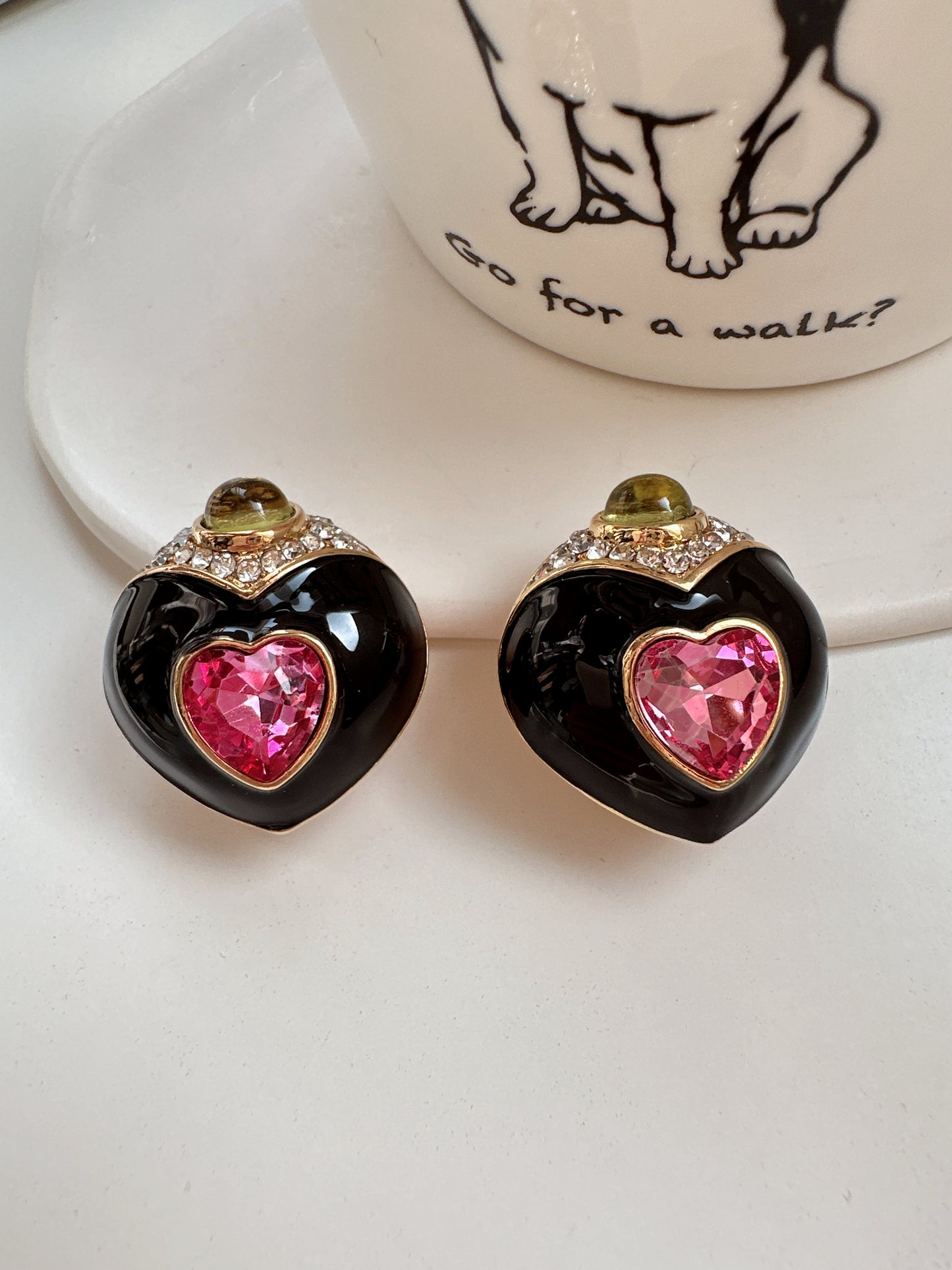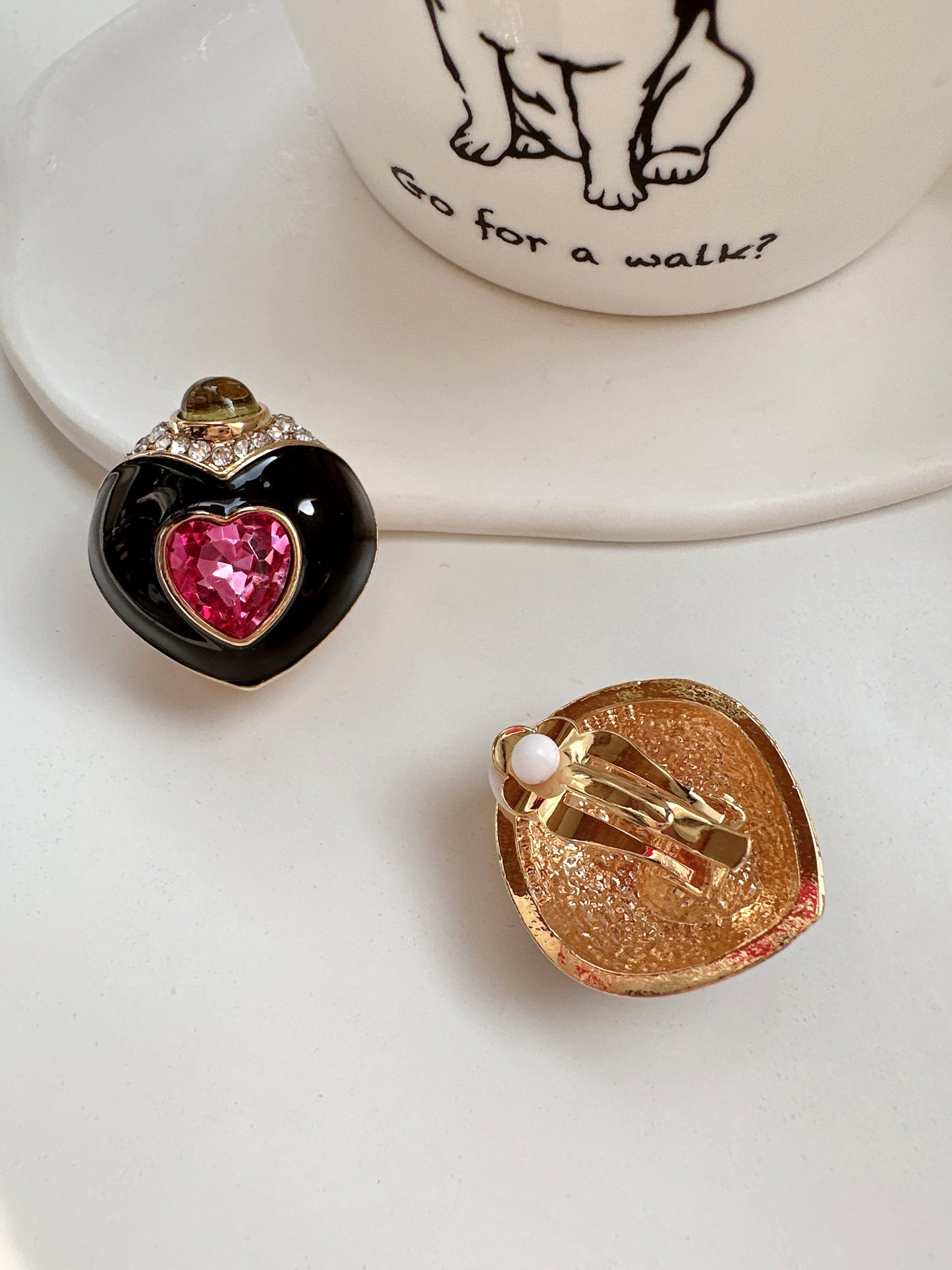 Vintage Pink Crystal Black Heart Clip On Earrings
