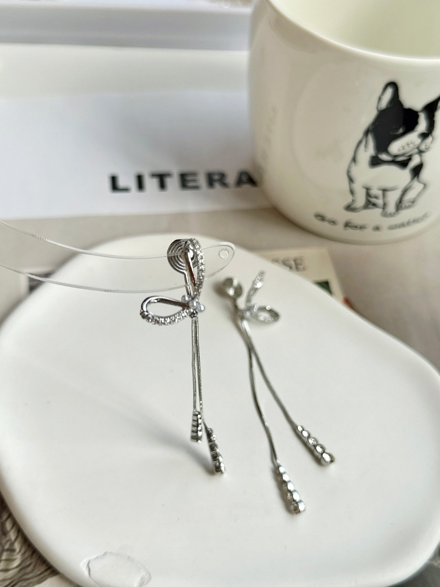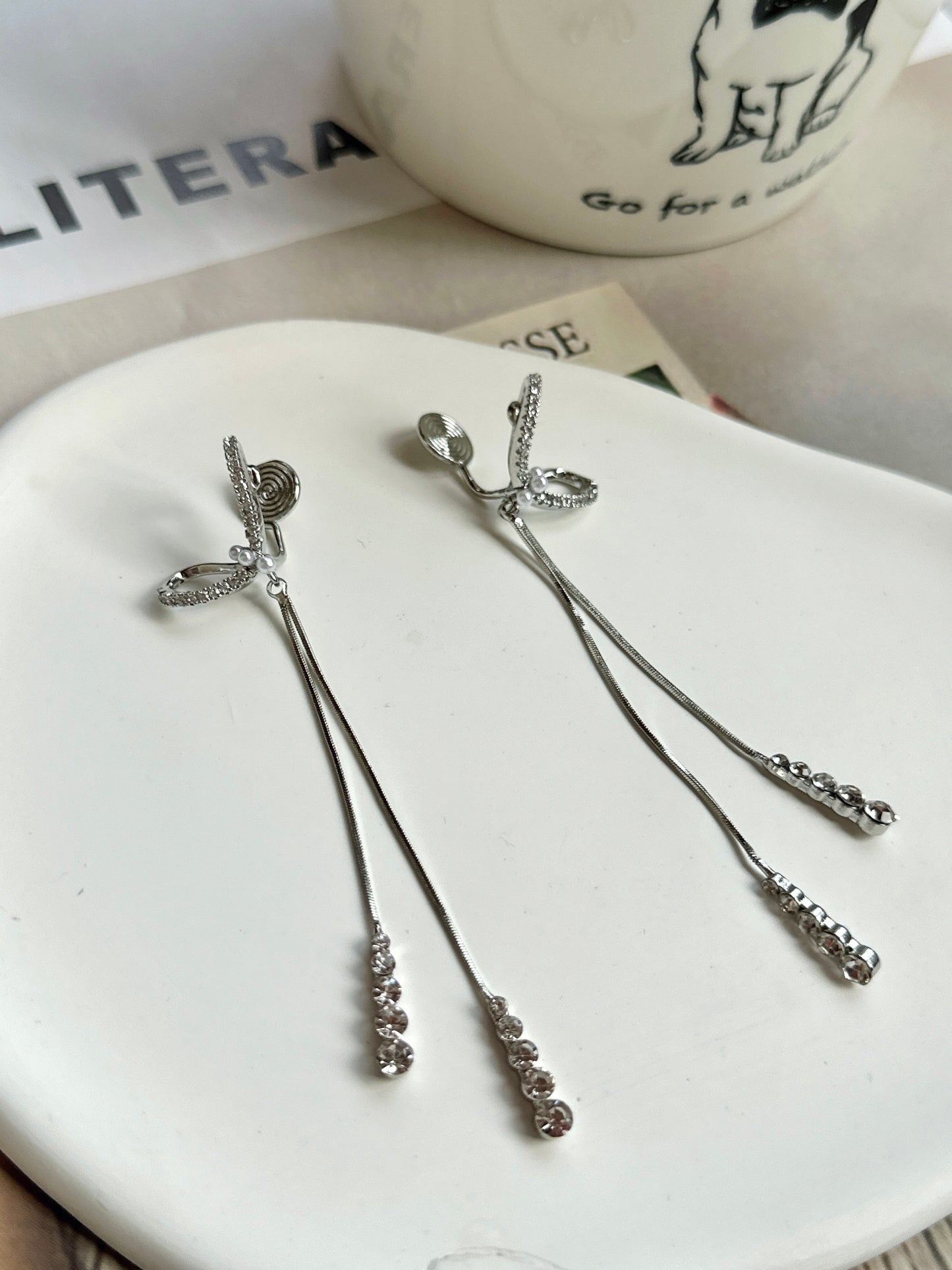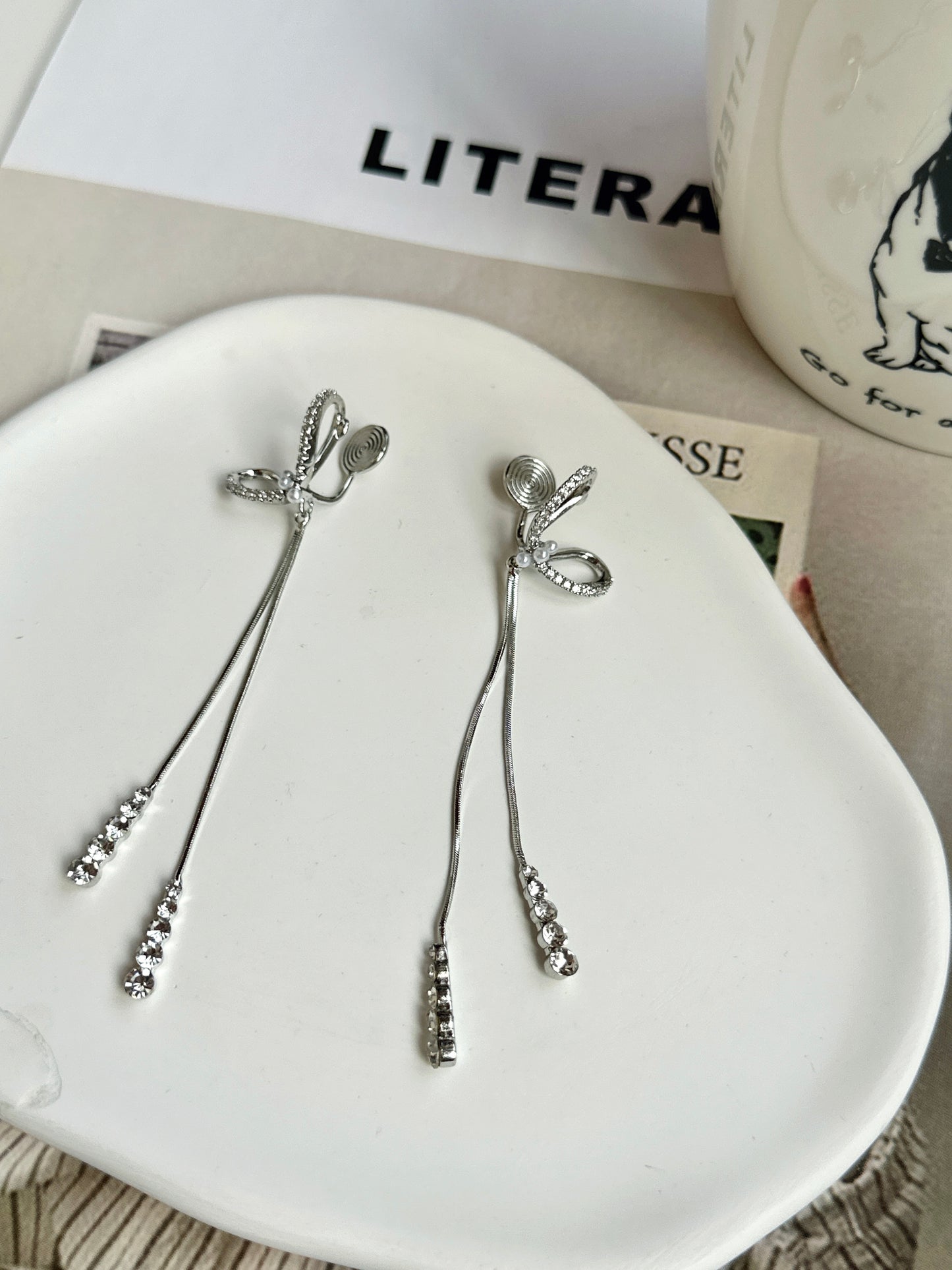 These elegant Diamante Bow Clip On Earrings feature a long tassel design, adding a touch of sophistication to any outfit. The shimmering diamante bow adds a touch of sparkle, while the comfortable clip on feature allows for easy wear. Perfect for any occasion, these earrings are an elegant addition to any jewelry collection.