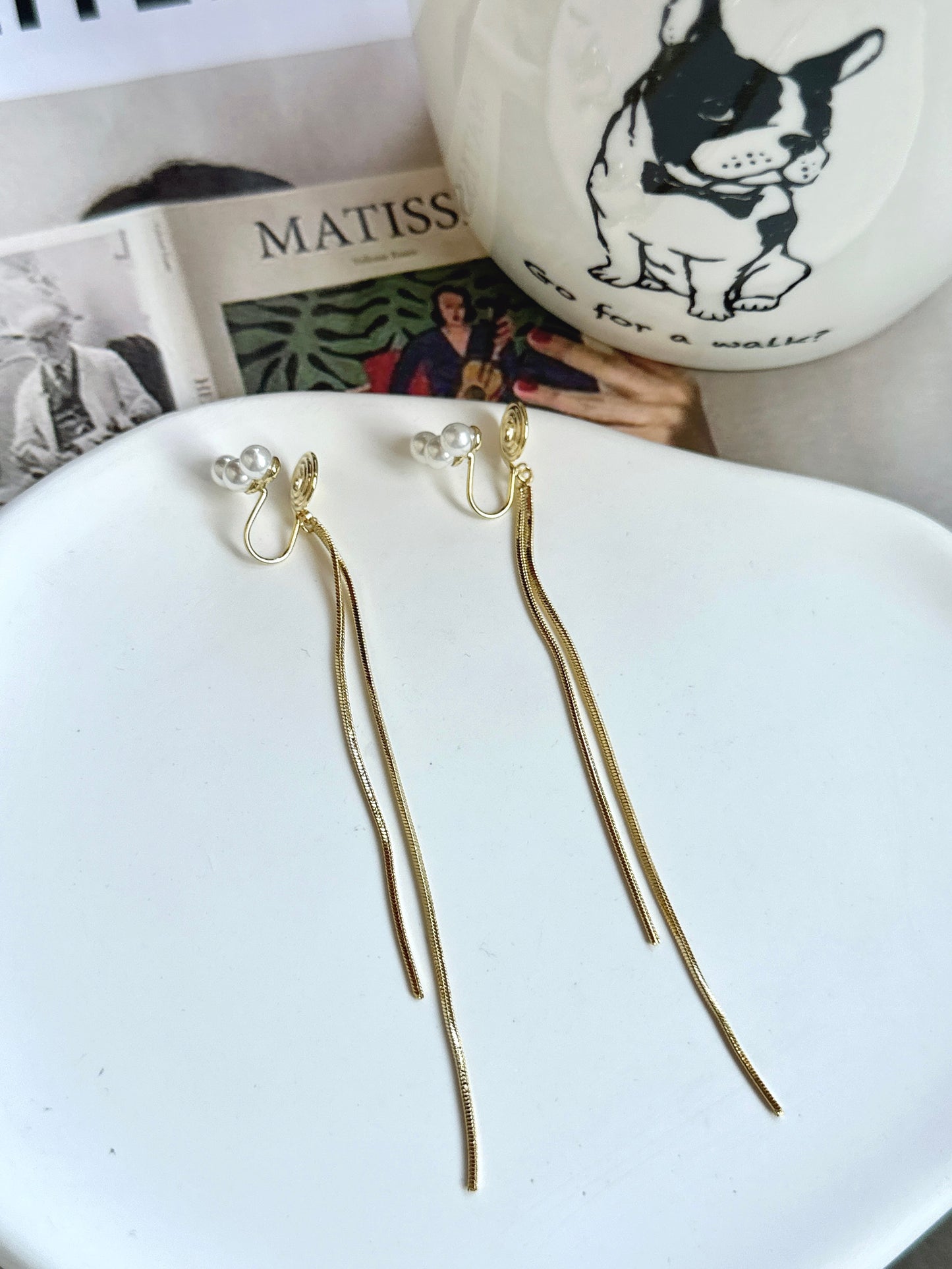 Experience the luxury of our Golden Pearlised clip-on earrings with a back chain for added glamour. The pearlised finish adds a touch of elegance to any outfit, and the clip-on design ensures comfort and convenience. Enhance your style and make a statement with these stunning earrings.