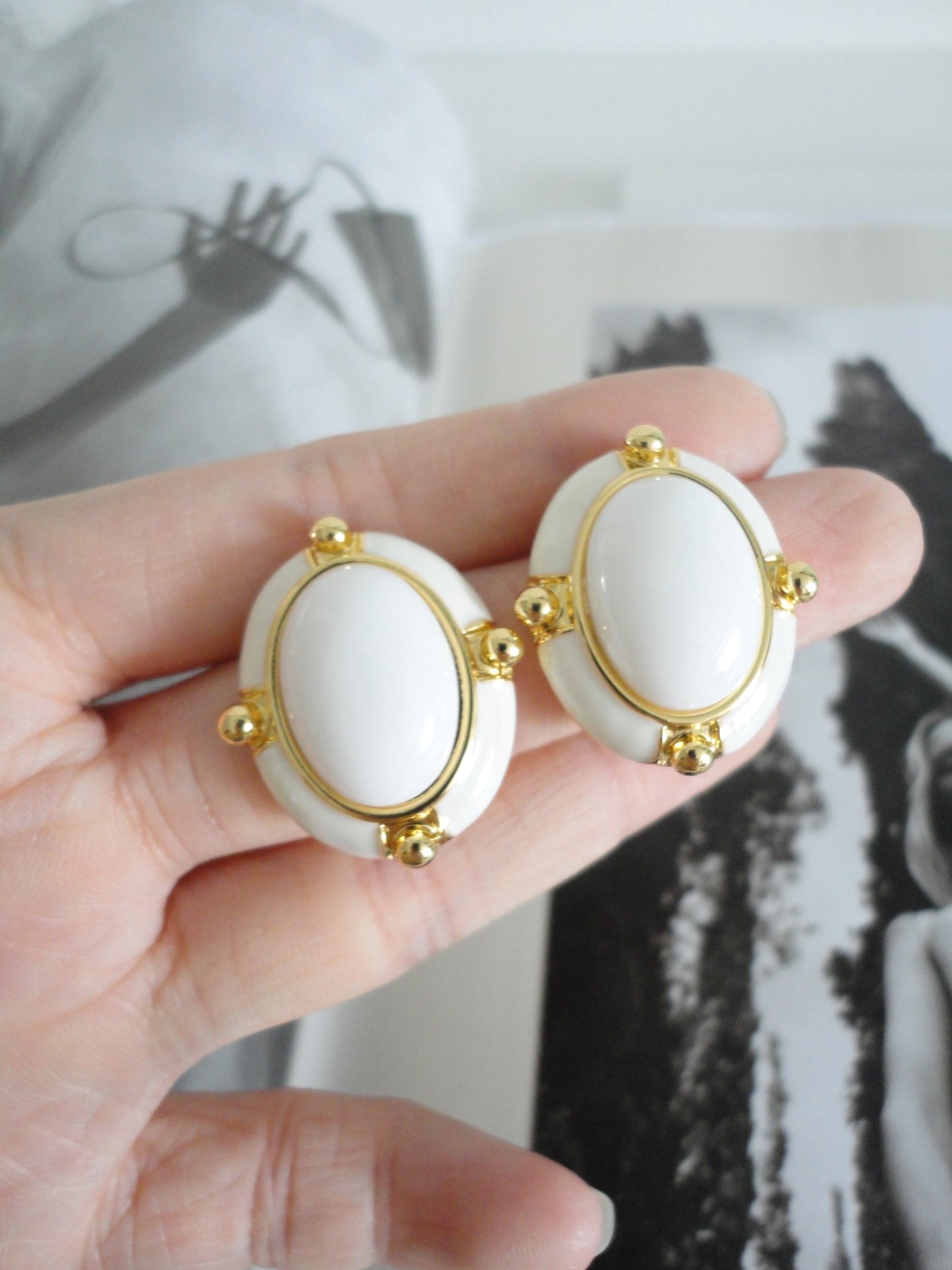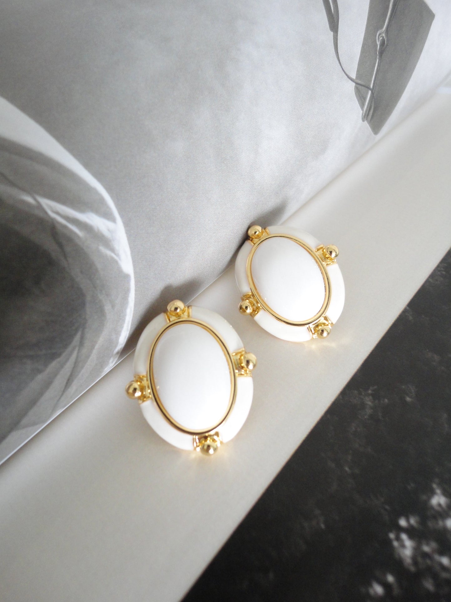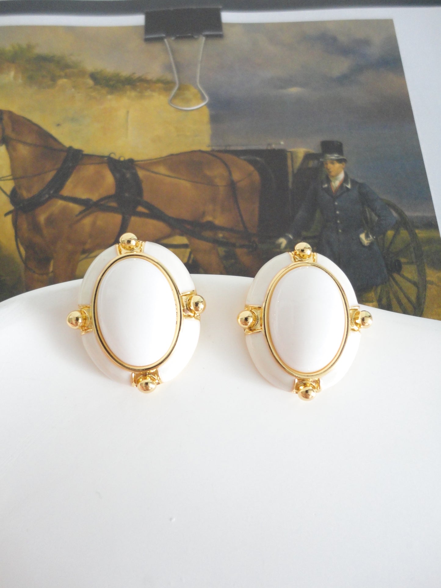White and Golden Vintage Oval Stud Earrings